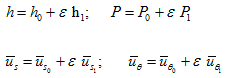 Clearances, pressures, and velocities are divided into mean components (subscript 0) that would pertain in the absence of whirl, and small linear perturbations (subscript 1) due to the eccentricity, ε, rotating at the whirl frequency, ω: