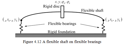For the present case, both the shaft and bearings are flexible as shown in Figure 4.12. All generalised coordinates are with respect to a fixed frame of reference and they are absolute displacements. The motion in two orthogonal planes will be considered simultaneously. The analysis allows finding different instantaneous displacements of the shaft at the disc and at bearings. The system will behave in a similar manner to that described in previous section, except that the flexibility of shaft will increase the overall flexibility of the support system as experienced by the rigid disc. An equivalent set of system stiffness and damping coefficients is first evaluated, which allows for the flexibility of the shaft in addition to that of bearings, and is used in place of bearing coefficients of the previous section analysis. The total deflection of the disc is the vector sum of the deflection of the disc relative to the shaft ends, plus that of shaft ends in bearings. For the disc, we observe the displacement of its geometrical centre.