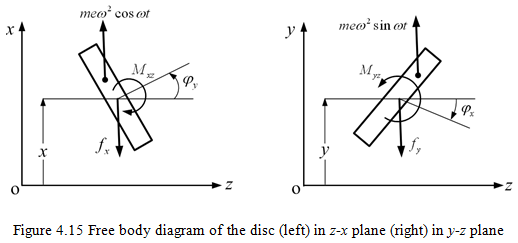 where the matrix [E] is similar to the stiffness matrix (it is equivalent stiffness of the shaft and bearings experienced at disc location). Equations of motion of the disc can be written in the x-direction and on the z-x plane (see Figure 4.15a), as