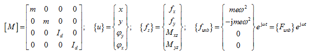 where [H]-1 is the equivalent dynamic stiffness matrix, as experienced by the disc, of the shaft and the bearing system. Once the response of the disc has been obtained, from above equation for given unbalance force, the loading applied to the shaft by the disc can be obtained by equation (4.62). Then from equation (4.49) we can get shaft ends deflections {Xb} at each bearings, which is substituted in equation (4.41) to get bearing forces {Fb}. Alternately, bearing forces can be used directly from equation (4.48). Displacements and forces have the complex form; the amplitude and the phase information can be extracted from the real and imaginary parts. Amplitudes will be the modulus of complex numbers, and phase angles of all these displacements can be evaluated by calculating arctangent of the ratio of the imaginary to real components as given by equations (4.33) and (4.34).