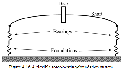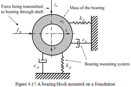 In some rotating machines, e.g. turbines, bearings themselves may be mounted on flexible foundations (Figure 4.16), which may in turn influence the motion of disc masses. In the present section, a very simple model of the foundation is considered by ignoring cross-coupled terms of the stiffness and the damping. For more detailed treatment on foundation effects, readers can refer to book by Krämer (1993).