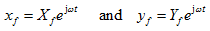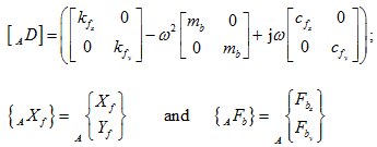 where Xf and Yf are complex displacements in the x and y directions, respectively. On substituting equation (4.73) in equations of motion (4.71) and (4.72), and on combining in the matrix form (for bearing A), it gives.