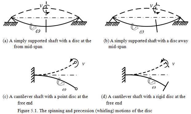 Figures 5.1(a) and (b) show the motion of a disc in a simply supported shaft (i.e., a Jeffcott rotor), when the disc is at the mid-span and at an offset positions, respectively. For the former case no gyroscopic effect would be present, since during whirling of the disc no precession motion takes place about its diameter. For the latter case, the precession of the disc, v, about its diametral axes takes place along with the spinning, ω, about the polar axis. This leads to the gyroscopic moment on the disc and it depends upon the spin speed, the precession velocity and polar mass moment of inertia of the rotor. Rotor systems with a point mass (with a negligible polar mass moment of inertia) and a thin disc (with an appreciable polar mass moment of inertia) are shown in Figures 5.1(c) and (d), respectively. The critical speeds of these rotor systems will not the same. This is due to the fact that centrifugal forces of particles of the disc do not lie in one plane during motion and thus form a moment tending to straighten the shaft and it will be discussed subsequently in more detail. Whereas in the case of point mass no such moment would be produced by centrifugal forces.