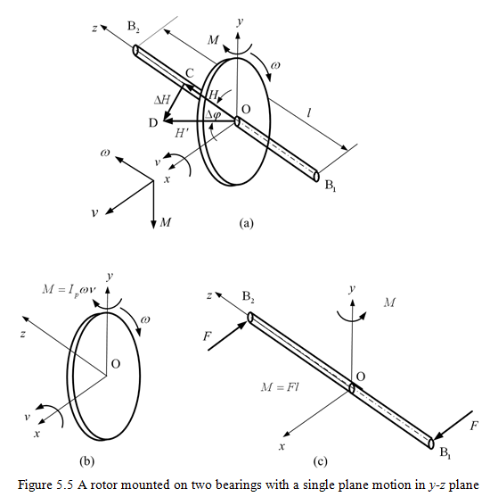 Let us assume that a rotor with a flexible massless shaft carrying a disc is constraint to move in a vertical (single) plane. It is assumed that the constraint is not providing any friction forces during the motion of the shaft in that plane. A rotor is spinning with a constant angular velocity, ω; the angular momentum, H, will be given by Ipω. Let x-y-z be the rectangular coordinate system (see Figure 5.5a), where oz is the spin axis, ox is the precession axis, and oy is the gyroscopic moment axis.