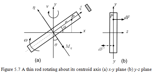 In Figure 5.7, we have z-axis as the axis of spin and y-axis as the axis of precession. Let ξ and η are the two orthogonal principal axes of the thin rod, with ξ making an angle of θ with the x-axis. Due to the Coriolis component of acceleration the force at a point P, of the mass dm is given as