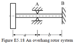 Exercise 5.18 Obtain transverse natural frequencies of a rotor system as shown in Figure E5.18. The mass of the thin disc is m = 5 kg and the diametral mass moment of inertia is Id = 0.02 kg-m2. Lengths of the shaft are a = 0.3 m and b = 0.7 m. The diameter of the shaft is 10 mm. Bearing A has the roller support and Bearing B has the fixed support condition. Neglect the mass of the shaft, however, consider the gyroscopic effect of the disc. E = 2.1 (10)11 N/m2. Compare and discuss the results with the case of without gyroscopic couple.