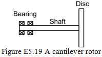 Exercise 5.19 Obtain the forward and backward transverse whirl frequencies corresponding to thrice the rotor speed for a general motion of a rotor as shown in Figure E5.19. The rotor is assumed to be fixed supported at one end. Take the mass of the disc m = 2 kg, the polar mass moment of inertia Ip = 0.01 kg-m2 and the diametral moment of inertia Id = 0.005 kg-m2. The shaft is assumed to be massless, and its length and diameter are 0.2 m and 0.1 m, respectively. Take the shaft Young’s modulus E = 2.1 X 1011 N/m2.