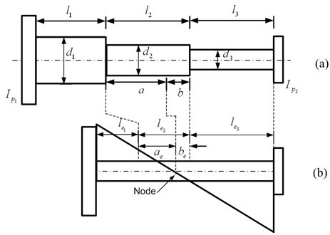 Figure 6.9(a) shows a stepped shaft with two large discs at ends with Ip is the polar mass moment of inertia (subscripts 1 and 2 represent the left and right hand side discs, respectively). It is assumed that the rotor has free-free boundary conditions and the polar mass moment of inertia of shaft is negligible as compared to two large discs at either ends of the shaft. In such cases the actual shaft should be replaced by an unstepped (uniform) equivalent shaft for the purpose of the analysis as shown in Fig. 6.9(b). The equivalent shaft diameter may be same as the smallest diameter of the real shaft (or any other diameter). The equivalent shaft must have the same torsional stiffness as the real shaft.