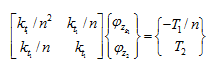 Gear-pair Element Equations : Equations (7.109) and (7.110) can be combined in the stiffness matrix form as