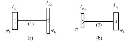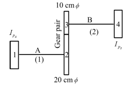 Solution : Now this problem will be solved by using the FEM for illustration of the method to geared system. The pinion and the gear have appreciable amount of the polar mass moment of inertia. Let us divide the geared system in two elements (Fig. 7.23). Denote the node number of the disc on branch A as 1, the gear as 2, the gear as 3 and the node number of the disc on branch B as 4 (Fig. 7.23).