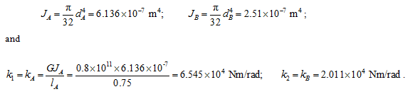 Example 7.8 For a simple-gear rotor system as shown in Figure 7.23, find torsional natural frequencies. The shaft ‘A' has the diameter of 5 cm and the length of 0.75 m, and the shaft ‘B' has the diameter of 4 cm and the length of 1.0 m. Take the modulus of rigidity of the shaft G equals to 0.8 × 1011 N/m2 , the polar mass moment of inertia of discs and gears are IpA = 24 Nm2 , IpB = 10 Nm2 , IpgA = 5 Nm2 , and IpgB = 3 Nm2 .