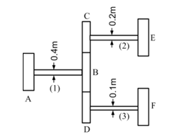 Example 7.9 Obtain torsional natural frequencies of a branched rotor system as shown in Figure 7.25. Take the polar mass moment of inertia of rotors and gears as: IpA = 0.01 kg-m2 , IpE = IpB = 0.005 kg-m2 and IpF = IpC = IpD = 0.006 kg-m2 . Take gear ratio between various gear pairs as: nBC = 3 and nBD = 4 . Shaft lengths are: lAB = lCE = lDF = 0.25 m and its diameters are dAB = 0.03 m, dCE = 0.02 m, and dDF = 0.02 m. Take the shaft modulus of rigidity G = 0.8 × 1011 N/m2 .