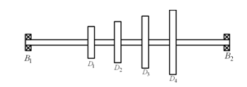 Exercise 7.12 Find torsional natural frequencies and mode shapes of the rotor system shown in Figure E7.12. B1 and B2 are frictionless bearings, which provide free-free end condition; and D1 , D2 , D3 and D4 are rigid discs. The shaft is made of the steel with the modulus of rigidity G = 0.8(10)11 N/m2 and a uniform diameter d = 20 mm. Various shaft lengths are as follows: B1D1 = 150 mm, D1D2 = 50 mm, D2D3 = 50 mm, D3D4 = 50 mm and D4D2 = 150 mm. The mass of discs are: m 1 = 4 kg, m 2 = 5 kg, m 3 = 6 kg and m 4 = 7 kg. Consider the shaft as mass-less. Consider discs as thin and take diameter of discs as d1 = 8 cm, d2 = 10 cm, d3 = 12 cm, and d4 = 14cm.