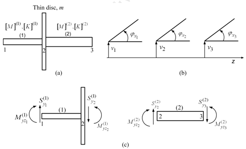 Figure 9.11 Two-element shaft with a rigid thin disc (a) discretisation of system, (b) nodal generalized coordinates, and (c) nodal forces and moments in elements.
