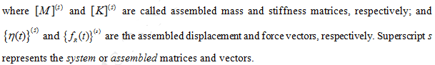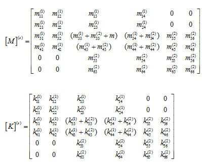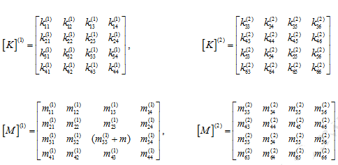 The mass and stiffness matrices for each of the element are obtained as in equation (9.78). By considering connectivity between various nodes the corresponding elemental mass and stiffness matrices are added to get the global mass and stiffness matrices. The elemental stiffness and mass matrices of equations (9.94) and (9.95), could be stated as follows (note that the poin t mass m is assumed to be attached to the element 1 at node 2)