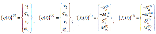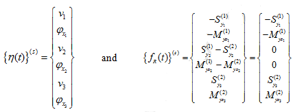 In previous sections, we have obtained the elemental mass and stiffness matrices, and the internal and external force vectors. The objective of the present section is to demonstrate how to get system mass and stiffness matrices and force vectors in terms of the elemental mass and stiffness matrices and force vectors as given in equation (9.78). To illustrate the same let us take a two-element system with a rigid disc at node 2 as shown in Figure 9.11(a). Nodal displacement variables are shown in Fig. 9.11(b) at each of the three nodes. In Fig. 9.11(c) two elements are shown with corresponding internal shear forces and bending moments, where in symbols the superscript specifies the element number and the subscript specifies the node number. Here the disc is assumed to be at node 2 of element 1. T he elemental differential equations for elements 1 and 2, respectively, may be written as