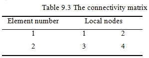Relationship between the elemental (local) nodal displacements and the system (or global) displacements is established through the connectivity matrix given in Table 9.3.