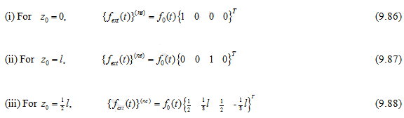 It should be noted that because of the uniformly distributed force over the element both forces and moments are present at both nodes of the element. In fact the total force over the element, f(t)l , is same as the total force at nodes of the element, i.e. on adding the first and third columns of the consistent force vector. In addition to these forces we have moments at the second and third columns. While following the lumped system approach, one would have distributed the total force equally at nodes without any moment terms.