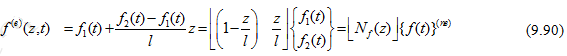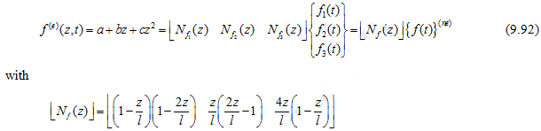 A quadratic variation of the force : In a quadratic polynomial one needs three constants to be determined. Hence, at least three nodes are required as shown in Figure 9.10 with node 3 as an internal node . At these nodes (i.e., at z = 0, 0.5 l and l ) corresponding force values f1(t), f2(t) and f3(t) must be sp ecified. So that the element force can be written as