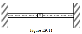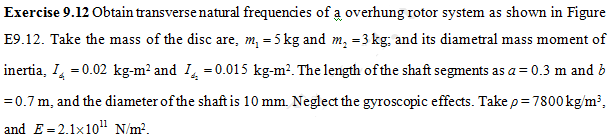 Exercise 9.11 Consider a rotor system as shown in Figure E9.11. Two flexible shafts are connected by a coupling (i.e., a pin joined). Other ends of shafts have fixed conditions. Formulate system governing equations for free transverse vibrations considering two elements. Obtain eigen value problem for the boundary condition mentioned. Take the length of each of the shaft as 0.5 m and the diameter as 0.05m. Young's modulus E = 2.1 (10)11N/m2 , and mass density of ρ = 7800 kg/m3. State the assumptions made. Use FEM.
