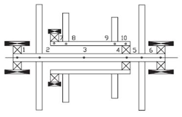 Exercise 9.13 The rotor In Fig. E9.13 is a typical twin-spool aero-engine rotor model, comprising lower pressure (LP) and high pressure (HP) spools rotating coaxially at different speeds with a speed ratio (HP/LP) of 1.5. Table E9.13 summarizes all the geometrical and physical parameters of the rotor bearing system. Obtain the critical speeds of such a rotor system with the help of Campbell diagram. For rotor