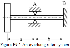 Exercise 9.1 Obtain transverse natural frequencies of a rotor system as shown in Figure E9.1. The mass of the disc is m = 5 kg and the diametral mass moment of inertia is Id = 0.02 kg-m2. Lengths of the shaft are a = 0.3 m and b = 0.7 m. The diameter of the shaft is 10 mm. Bearing A has the roller support and Bearing B has the fixed support condition. Consider (i) neglect the mass of the shaft and (ii) retain the mass of the shaft.