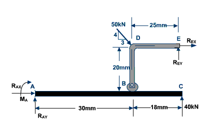 Free-Body Diagram: The structure is fixed at point A and pinned at point E. In addition, member BDE is resting on beam ABC through a roller at point B. Let's draw the free-body diagram of the structure as a whole first. |
