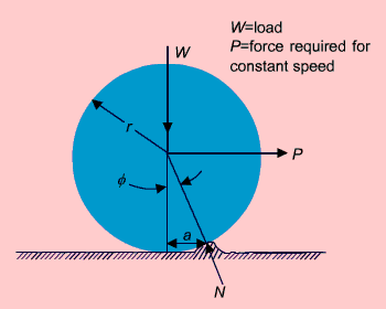 resistance if we examine the deformation shown in an exggerated manner in the above figure. If force P is along the centreline as shown, the equivalent force system coming onto the roller from the region of contact must be that of a force N whose line of action also goes through the centre of the roller since, you will that three nonparallel forces must be concurrent for equilibrium. In order to develope a resistance to motion, N must be oriented at an angle