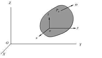 Let us choose, an axis system xyz on the body.The small " o" is the origin, a point on the body. Choose another axis system OXY which is considered to be fixed, i.e., the velocity and acceleration of point O is always zero. Assume the xyz axes remain parallel to XYZ. Then, the velocity of point P with respect to O may be written as