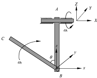 An example: Consider the following figure. Link 1 is pinned on the frame and rotates with angular speed about axis X. Link 2 is pinned at link 1 at point B. Link 2 has the angular speed . The y-axis is perpendicular to the plane of your screen.