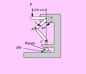 A hand operated press is shown in the figure. If a force F is applied at the lever, find out the compressive force acting on the job. The lengths of AB and BC each are 200 mm.