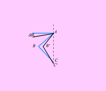 For solving this problem, let us give a virtual rotation ccw to the lever. As a result of this, the punch moves downward. Let us say that the vertical punch force is Fp . Figure below shows the original (blue) and virtually displaced (black) configuration. Now let us calculated the virtual work done by the forces. |