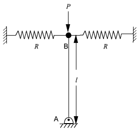 A light rod of length l is held in vertical position by two springs of stiffness R. If a load P is applied at the free end, the rod can be in equilibrium, because the pin reaction in A can balance the load P. We have to find out for what values of P, the rod is in stable equilibrium.