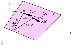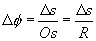 Next, we note in the following figure that the lines from point O to the points s and s+Ds along the trajectory form the same angle Df as is between the vectors and in the vector traingle, and so we can say: