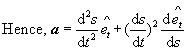 What does this expression show? The acceleration is composed of two parts. One part is tangential to curve and is equal to the rate of change of speed. The other part is in the direction of
