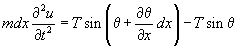 If the lateral deflection is small, the change in tension T due to the deflection is negligible. Figure 10.4(c) shows the free body diagram of an elemental length dx of the string. When the string is vibrating, in the y direction inertia force is acting. Considering the forces in the vertical direction, applying Newton 's second law one may have