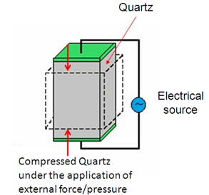 Piezoelectric sensor is used for the measurement of pressure, acceleration and dynamic-forces such as oscillation, impact, or high speed compression or tension. It contains piezoelectric ionic crystal materials such as Quartz (Figure 2.4.10). On application of force or pressure these materials get stretched or compressed. During this process, the charge over the material changes and redistributes. One face of the material becomes positively charged and the other negatively charged. The net charge q on the surface is proportional to the amount x by which the charges have been displaced. The displacement is proportion to force. Therefore we can write,