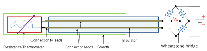Figure 2.5.3 shows the construction of a RTD. It has a resistor element connected to a Wheatstone bridge. The element and the connection leads are insulated and protected by a sheath. A small amount of current is continuously passing though the coil. As the temperature changes the resistance of the coil changes which is detected at the Wheatstone bridge.