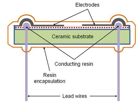 Figure 2.5.6 shows the construction of a photo resistor. The CdS resistor coil is mounted on a ceramic substrate. This assembly is encapsulated by a resin material. The sensitive coil electrodes are connected to the control system though lead wires. On incidence of high intensity light on the electrodes, the resistance of resistor coil decreases which will be used further to generate the appropriate signal by the microprocessor via lead wires.