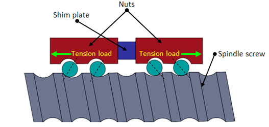In order to obtain bidirectional motion of the carriage without any positional error, the backlash between the nut and screw should be minimum. Zero backlash can be obtained by fitting two nuts with preloading (tension or compression) or by applying a load which exceeds the maximum operating load. Figure 4.4.3 shows double nut preloading system. A shim plate (spacer) is inserted between two nuts for preloading. Preload is to create elastic deformations (deflections) in steel balls and ball grooves in the nut and the screw shaft in advance by providing an axial load. As a result the balls in one of the nuts contact the one side of the thread and balls in the other nut contact the opposite side.
