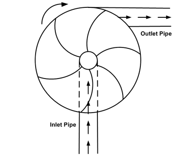 Centrifugal pump uses rotational kinetic energy to deliver the fluid. The rotational energy typically comes from an engine or electric motor. The fluid enters the pump impeller along or near to the rotating axis, accelerates in the propeller and flung out to the periphery by centrifugal force as shown in figure 5.1.3. In centrifugal pump the delivery is not constant and varies according to the outlet pressure. These pumps are not suitable for high pressure applications and are generally used for low-pressure and high-volume flow applications. The maximum pressure capacity is limited to 20-30 bars and the specific speed ranges from 500 to 10000. Most of the centrifugal pumps are not self-priming and the pump casing needs to be filled with liquid before the pump is started.