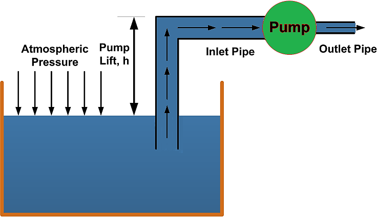 In general, the pump is placed over the fluid storage tank as shown in figure 5.1.5. The pump creates a negative pressure at the inlet which causes fluid to be pushed up in the inlet pipe by atmospheric pressure. It results in the fluid lift in the pump suction. The maximum pump lift can be determined by atmospheric pressure and is given by pressure head as given below:
