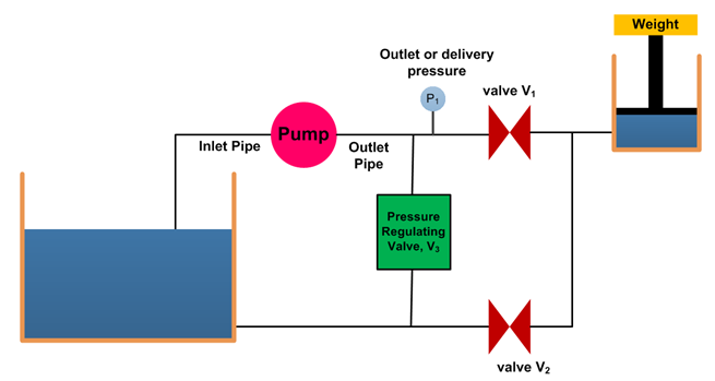 The schematic of pressure regulator and various valves placement is shown in figure 5.1.6. When the valve V1 is closed and V2 is opened then the load moves down and fluid returns to the tank but the pump is dead ended and it leads to a continuous increase in pressure at pump delivery. Finally, it may lead to permanent failure of the pump. Therefore some method is needed to keep the delivery pressure P1 within the safe level. It can be achieved by placing pressure regulating valve V3 as shown in figure 5.1.6. This valve is closed in normal conditions and when the pressure exceeds a certain limit, it opens and fluid from pump outlet returns to the tank via pressure regulating valve V3. As the pressure falls in a limiting range the valve V3 closes again.