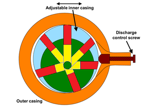 The amount of fluid that is displaced by a vane pump running at a constant speed is determined by the maximum extension of the vanes and the vanes width. However, for a pump running in operation, the width of vanes cannot be changed but the distance by which the vanes are extended can be varied. This is possible by making a provision for changing the position of the cam ring (adjustable inner casing) relative to the rotor as shown in figure 5.3.4. The eccentricity of rotor with respect to the cam ring is adjusted by the movement of the screw. The delivery volume increases with increase in the eccentricity. This kind of arrangement can be used to achieve a variable volume from the pump and is known as variable displacement vane pump.