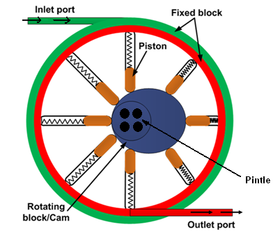 The typical construction of radial piston pump is shown in Figure 5.3.7. The piston pump has pistons aligned radially in a cylindrical block. It consists of a pintle, a cylinder barrel with pistons and a rotor containing a reaction ring. The pintle directs the fluid in and out of the cylinder. Pistons are placed in radial bores around the rotor. The piston shoes ride on an eccentric ring which causes them to reciprocate as they rotate. The eccentricity determines the stroke of the pumping piston. Each piston is connected to inlet port when it starts extending while it is connected to the outlet port when start retracting. This connection to the inlet and outlet port is performed by the timed porting arrangement in the pintle. For initiating a pumping action, the reaction ring is moved eccentrically with respect to the pintle or shaft axis. As the cylinder barrel rotates, the pistons on one side travel outward. This draws the fluid in as the cylinder passes the suction port of the pintle. It is continued till the maximum eccentricity is reached. When the piston passes the maximum eccentricity, pintle is forced inwards by the reaction ring. This forces the fluid to flow out of the cylinder and enter in the discharge (outlet) port of the pintle.