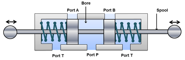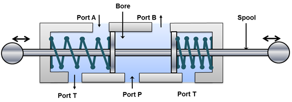 Figure 5.5.3 shows a three position four way valve in the closed center position. The working of the valve is similar to open center DCV. In closed center DCV all user ports (port A and port B) are closed. Therefore, these ports are hydraulically locked and the actuator cannot be moved by the external load. The pumped fluid flows through the relief valve. The pump works under the high pressure condition which not only wastes the pump power but also causes wear of the pump parts. The fluid temperature also rises due to heat generation by the pump energy transformation. The increase in fluid temperature may lead to the oxidation and viscosity drop of the fluid. The oxidation and viscosity drop reduces the pump life and leakage in the system.