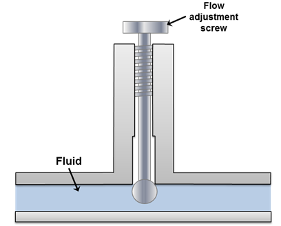 In practice, the speed of actuator is very important in terms of the desired output and needs to be controlled. The speed of actuator can be controlled by regulating the fluid flow. A flow control valve can regulate the flow or pressure of the fluid. The fluid flow is controlled by varying area of the valve opening through which fluid passes. The fluid flow can be decreased by reducing the area of the valve opening and it can be increased by increasing the area of the valve opening. A very common example to the fluid flow control valve is the household tap. Figure 5.5.11 shows the schematic diagram of a flow control valve. The pressure adjustment screw varies the fluid flow area in the pipe to control the discharge rate.