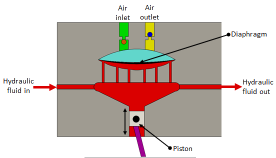 These are small capacity compressors. In piston compressors the lubricating oil from the pistons walls may contaminate the compressed air. The contamination is undesirable in food, pharmaceutical and chemical industries. For such applications diaphragm type compressor can be used. Figure 6.2.1 shows the construction of Diaphragm compressor. The piston reciprocates by a motor driven crankshaft. As the piston moves down it pulls the hydraulic fluid down causing the diaphragm to move along and the air is sucked in. When the piston moves up the fluid pushes the diaphragm up causing the ejection of air from the outlet port. Since the flexible diaphragm is placed in between the piston and the air no contamination takes place.