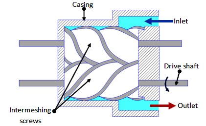 Piston compressors are used when high pressures and relatively low volume of air is needed. The system is complex as it has many moving parts. For medium flow and pressure applications, screw compressor can be used. It is simple in construction with less number of moving parts. The air delivered is steady with no pressure pulsation. It has two meshing screws. The air from the inlet is trapped between the meshing screws and is compressed. The contact between the two meshing surface is minimum, hence no cooling is required. These systems are quite in operation compared to piston type. The screws are synchronized by using external timing gears.
