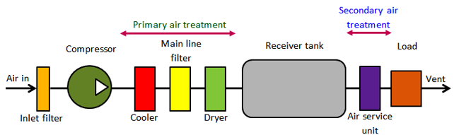 In the first stage, the large sized particles are prevented from entering the compressor by an intake filter. The air leaving the compressor may be humid and may be at high temperature. The air from the compressor is treated in the second stage. In this stage temperature of the compressed air is lowered using a cooler and the air is dried using a dryer. Also an inline filter is provided to remove any contaminant particles present. This treatment is called primary air treatment. In the third stage which is the secondary air treatment process, further filtering is carried out. A lubricator introduces a fine mist of oil into the compressed air. This will help in lubrication of the moving components of the system to which the compressed air will be applied.